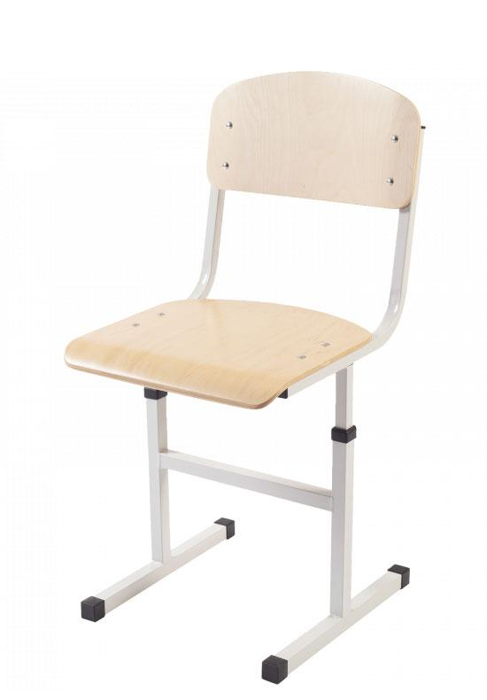 Стілець Т-подібний,(опція р.г.№3) №4-6, лакове покриття фанери, каркас - міцна квадратна труба KOMODO. Розміри: ширина – 380 мм; глибина – 424,465 мм; висота – 775,825,855 мм; Стілець може регулюватися по висоті: 350 мм (опція р.г. №3); 380 мм (№4); 430 мм (№5); 460 мм (№6). Стілець складається з накладного сидіння, спинки та металевого каркасу. Сидіння та спинка виготовлені з гнуто-клеєної фанери (товщиною 8,5 мм) та покриті безкольоровим екологічно-чистим лаком на водній основі. Кути сидіння та спинки мають радіуси заокруглення для запоб. травмування. Спинка і сидіння до каркасу кріпляться гвинтами та гайками, сидіння регулюється по глибині. Метал. каркас посилений квадратною трубою ( 20х20х1,2 мм) та покритий зносостійким порошковим фарбуванням, яке захищає від корозії та подряпин. Регулювання висоти стільця здійснюється за допомогою гвинтів по отворах каркасу і перехідної втулки. Пластикові наконечники забезпечують захист підлоги та сприяють запобіганню травмування учнів.